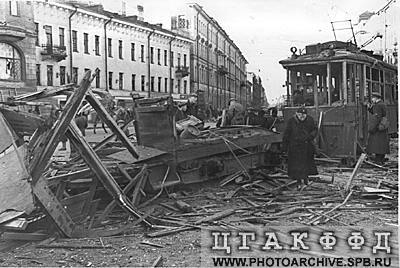 www.photoarchive.spb.ru. Трамвай, разрушенный прямым попаданием фугасной бомбы, на площади Нахимсона. 1941 г.