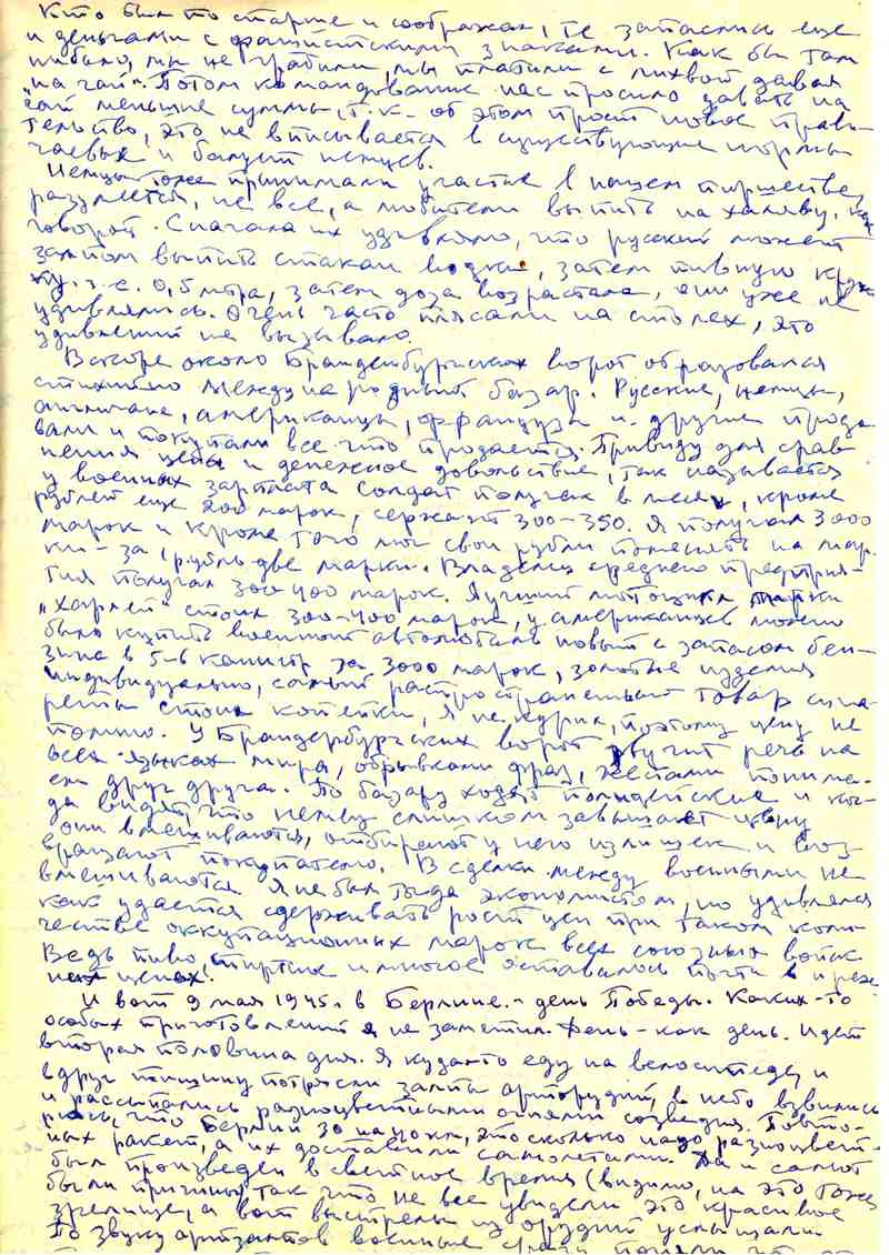 Вскоре около Бранденбургских ворот образовался стихийно международный базар. Русские, немцы, англичане, американцы, французы и другие продавали и покупали все что продается. Приведу для сравнения цены и денежное довольствие, так называется у военных зарплата солдат, который получал в месяц, кроме рублей, ещё 200 марок, сержант – 300-350. Я получал 3000 марок и, кроме того, мог свои рубли поменять на марки — за рубль две марки. Владелец среднего предприятия получал 300-400 марок. Лучший мотоцикл марки «Харлей» стоил 300-400 марок, у американцев можно было купить военный автомобиль, новый, с запасом бензина в 5-6 канистр за 3000 марок, золотые изделия индивидуально, самый распространенный товар – сигареты – стоил копейки. Я не курил, поэтому цену не помню. У Бранденбургских ворот звучит речь на всех языках мира, обрывками фраз, жестами понимали друг друга. По базару ходят полицейские и, когда видят, что немец слишком завышает цену, они вмешиваются, отбирают у него излишек и возвращают покупателю. В сделки между военными не вмешиваются. Я не был тогда экономистом, но удивлялся, как удается сдерживать рост цен при таком количестве оккупационных марок всех союзных войск. Ведь пиво, спиртное и многое оставалось почти в прежних ценах.