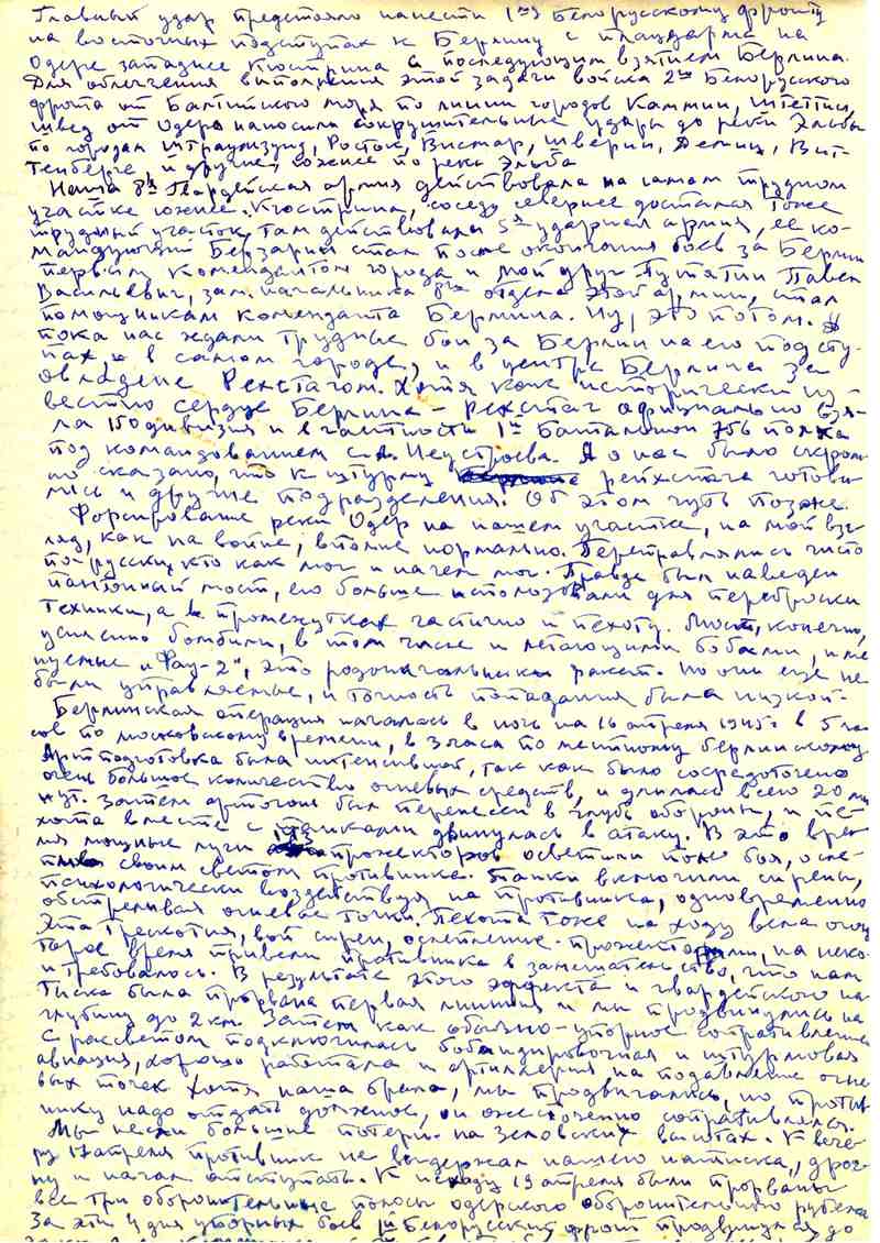 Наша 8-я Гвардейская армия действовала на самом трудном участке южнее Кюстрина, соседу севернее достался тоже трудный участок. Там действовала 5-я Ударная армия, её командующий Берзарин стал после окончания боёв за Берлин первым комендантом города, и мой друг Путятин Павел Васильевич, зам. начальника 8-го отдела этой армии, стал помощником коменданта Берлина. Ну, это потом. А пока нас ждали трудные бои за Берлин на его подступах и в самом городе, и в центре Берлина за овладение Рейхстагом. Хотя, как исторически известно, сердце Берлина – Рейхстаг – официально взяла 150 дивизия, и в частности 1-й батальон 756 полка под командованием С.А. Неустроева. А о нас было скромно сказано, что к штурму Рейхстага готовились и другие подразделения. Об этом чуть позже.
