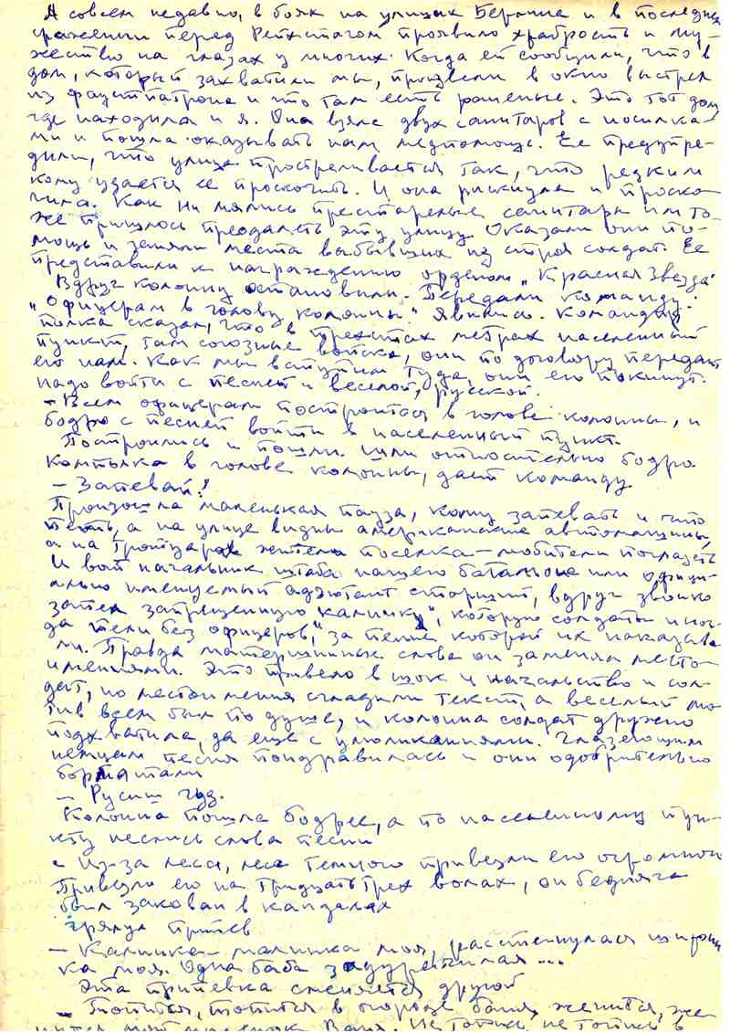 А совсем недавно, в боях на улицах Берлина и в последнем сражении перед Рейхстагом проявила храбрость и мужество на глазах у многих, когда ей сообщили, что в дом, который захватили мы, произвели выстрел из фаустпатрона, и что там раненые. Это тот дом, где находился и я. Она взяла двух санитаров с носилками и пошла оказывать нам медпомощь. Ее предупредили, что улица простреливается так, что редко кому удается её проскочить. И она рискнула и проскочила. Как не мялись престарелые санитары, им тоже пришлось преодолеть эту улицу. Оказали они помощь и заняли места выбывших из строя солдат. Её представили к награждению орденом «Красная звезда».