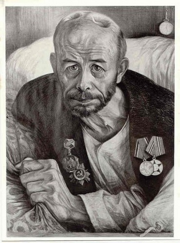 «Старый воин». Ратник трех войн: русско-японской (1904-1905 гг.), Первой мировой (1914-1918 гг.), Второй мировой (1939-1945 гг.) Когда художник рисовал Михаила Казанкова, тому исполнилось 90 лет. Кавалер двух Георгиевских крестов за Первую мировую войну, воин закончил свою геройскую жизнь на острове Валаам.