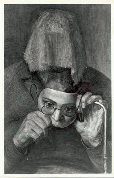 «Предупреждение». Рисунок, сделанный по воспоминаниям первых послевоенных лет, изображает безумного инвалида войны, которого 9-летний Геннадий Добров видел в Сибири в 1946 году. Говорят, самое преступное – отнять у человека разум. Война отняла его.