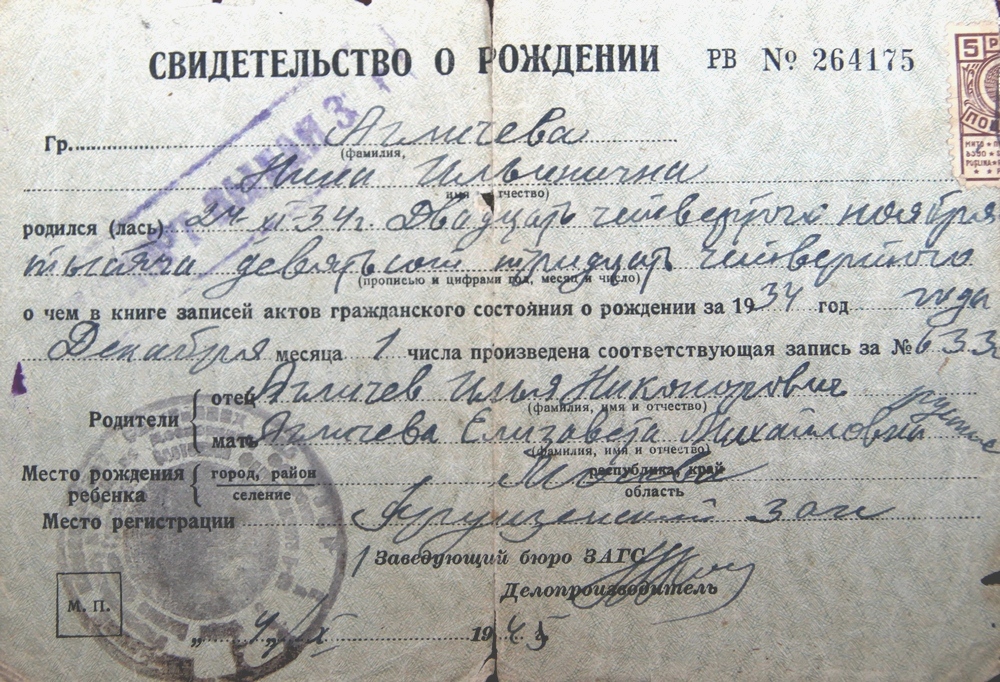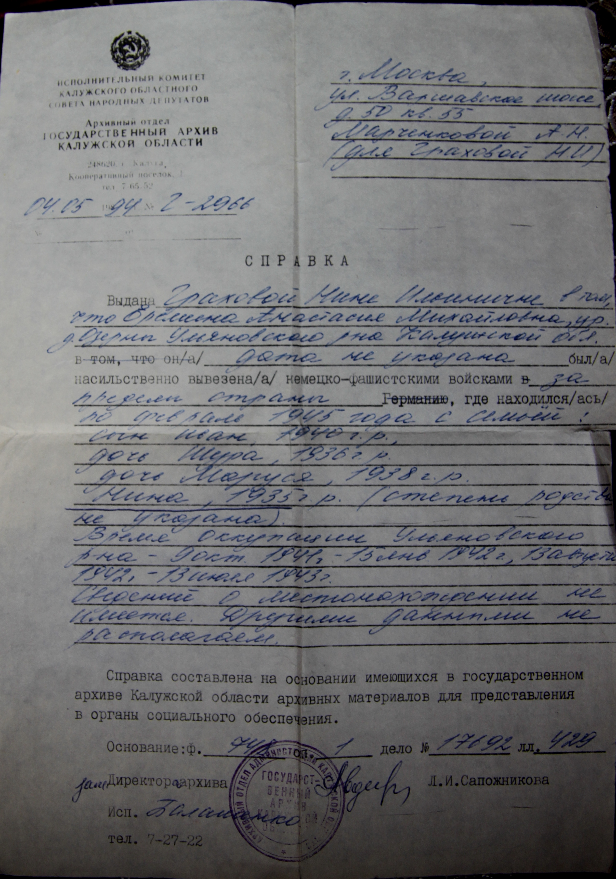 Вот документ, на основании которого я числюсь малолетним узником. Мне его дали в Калужской области. Только в нем год рождения неправильно указан. Этот документ оформили на мою тетю Анастасию Михайловну. Здесь перечислены ее трое детей и я. Мне приписали один год и родственная связь между нами даже не указана. Тетя Анастасия умерла и двое ее детей. Осталась в живых только дочка Шура. Шура живет в Америке у своей дочери, которая вышла замуж за американца.
