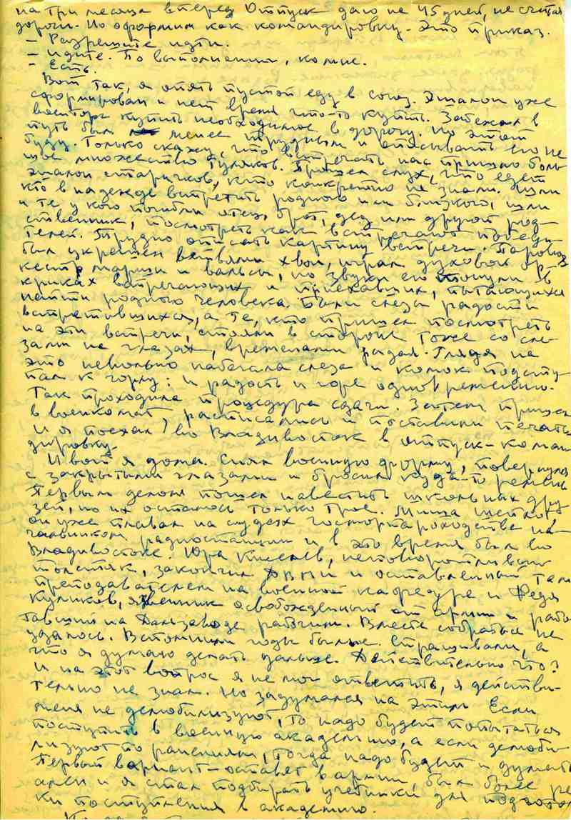 Узнал, что в деревне только вот такие старики и два инвалида с фронта. Один без ноги, другой без руки, да нас с сержантом двое. Такое же положение и в соседних деревнях. В соседней деревне Воробьёвке узнали, что в Колосовку приехали двое с фронта целые, вечером девки приедут нас смотреть, правда ли это.