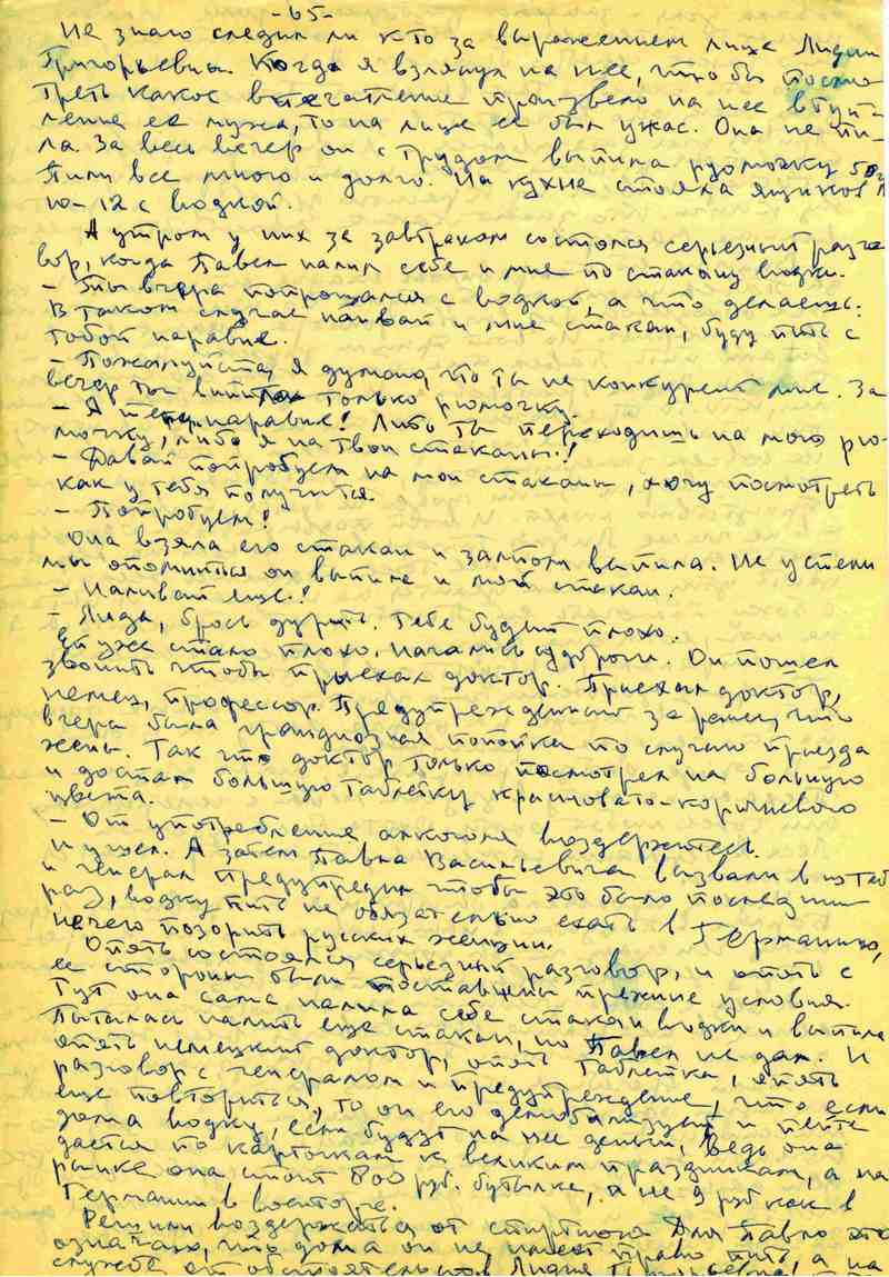 Не знаю, следил ли кто за выражением лица Лидии Григорьевны. Когда я взглянул на неё, чтобы посмотреть, какое впечатление произвело на неё выступление её мужа, то на лице её был ужас. Она не пила. За весь вечер с трудом выпила рюмочку 50 грамм. Пили все много и долго. На кухне стояло ящиков 10-12 с водкой. А утром у них за завтраком состоялся серьёзный разговор, когда Павел налил себе и мне по стакану водки.