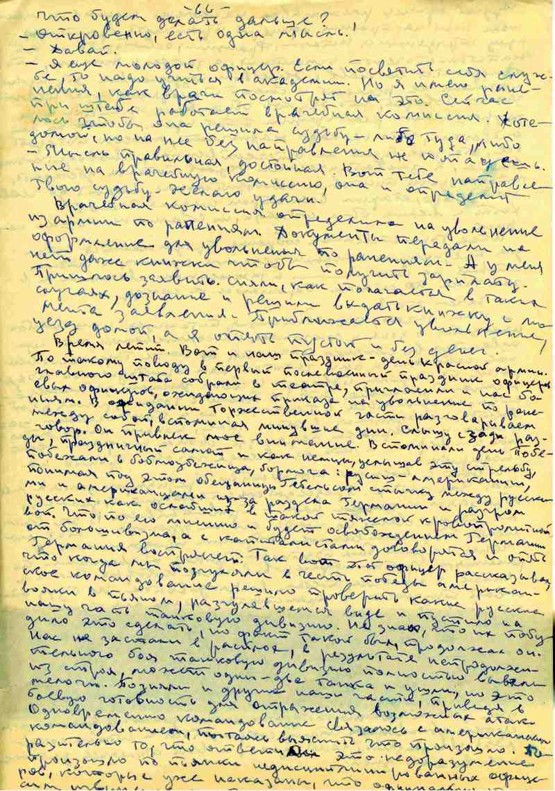 — Я ещё молодой офицер. Если посвятить себя службе, то надо учиться в академии. Но я имею ранения, как врачи посмотрят на это? Сейчас при штабе работает врачебная комиссия. Хотелось, чтобы она решила судьбу – либо туда, либо домой, но на неё без направления не попадёшь.