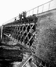 Толовыми шашками саперы пробивали «окна» в ледовом панцире реки. Взрыв! – и «окно» готово. Тут же бойцы копровых команд тащат к нему 20-метровую сваю. На вбитые в дно сваи укладываются поперечины, на них – продольные брусья, и лишь на втором слое продольных брусьев укреплялись шпалы и рельсы.