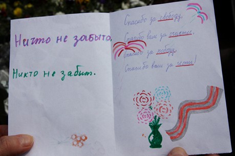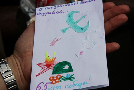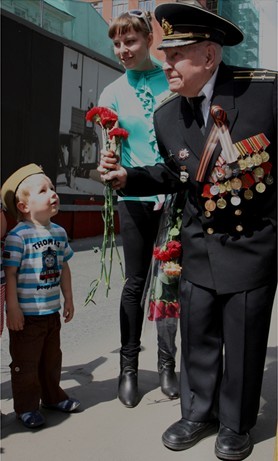 Девушка еле удерживает в руке много цветов, а ведь они еще не дошли до площади. Люди подходят, говорят слова благодарности и дарят цветы, в основном, гвоздики. Этот малыш не может оторвать глаз от ветерана. Цветы он подарил с почтительным благоговением.