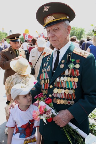 Девушка еле удерживает в руке много цветов, а ведь они еще не дошли до площади. Люди подходят, говорят слова благодарности и дарят цветы, в основном, гвоздики. Этот малыш не может оторвать глаз от ветерана. Цветы он подарил с почтительным благоговением.
