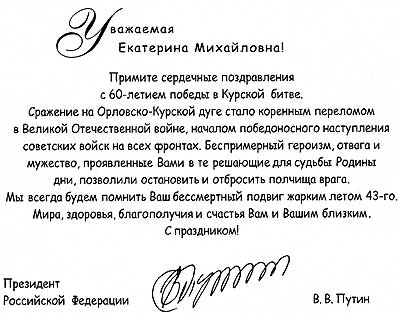 В канун 60-летия победы под Курском матушка София получила поздравительный адрес от президента России В.В.Путина. Наместник Раифского монастыря Архимандрит Всеволод и братия обители так же поздравляют матушку Софию с этой знаменательной датой и молитвенно желают ей многих милостей Господних и долгих лет жизни на радость всем людям. Низкий поклон Вам, матушка, за Ваш великий подвиг!
