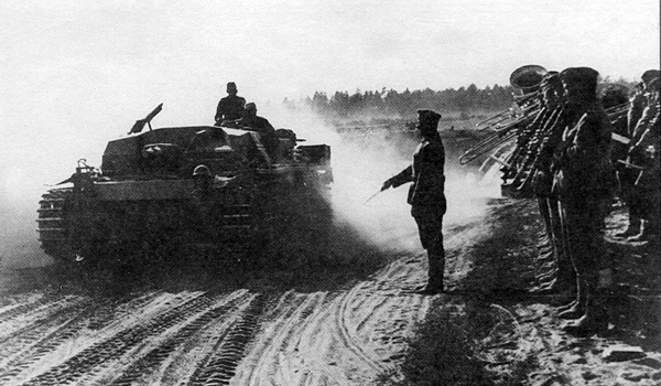 Батарею немецких штурмовых орудий StuGIII Ausf.B встречает духовой оркестр. Они еще уверены, что так будет всегда...