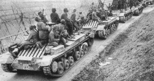 На марше легкие танки английского производства МК III "Валетайн" IX/X из состава 5-го кавалерийского корпуса Красной Армии.
