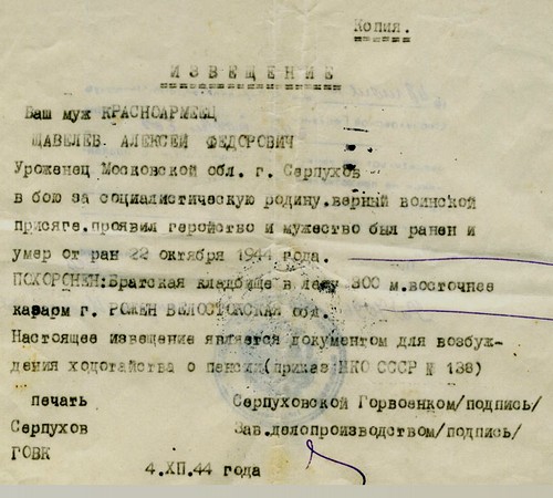А в 1944 году пришла похоронка – папа погиб в Польше. Помню, как мама кричала, лежа на кровати, а мы, собравшись вокруг, пытались её успокоить. Мама не верила, что папы больше нет, и часто ходила к гадалке на рыночную площадь. Гадалка всегда и всем говорила, что боец жив, что пропал без вести, что вернется, тем и кормилась, а в женщин вселяла надежду. Мы тоже гадали: вечером при свете свечи, электричества не было, брали кусочек хлеба, привязывали к нему ниточку и раскачивали в разные стороны. Очень радовались, если хлеб поворачивался в ту сторону, которую загадали как «живой». С надеждой жить было намного легче. Но отец уже не вернулся. Война кончилась, мы выросли, а голодное военное детство осталось в нашей памяти на всю жизнь.