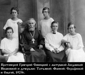 23 января 1873 года в Херсонской губернии, мест. Ровное в семье потомственных священнослужителей родился будущий протоиерей Синицкий Григорий Дмитриевич. В 1885 году окончил Одесскую Духовную Семинарию. Начал свое служение псаломщиком в Успенском соборе г. Александрия Херсонской губернии. В 1896 году рукоположен в священника.