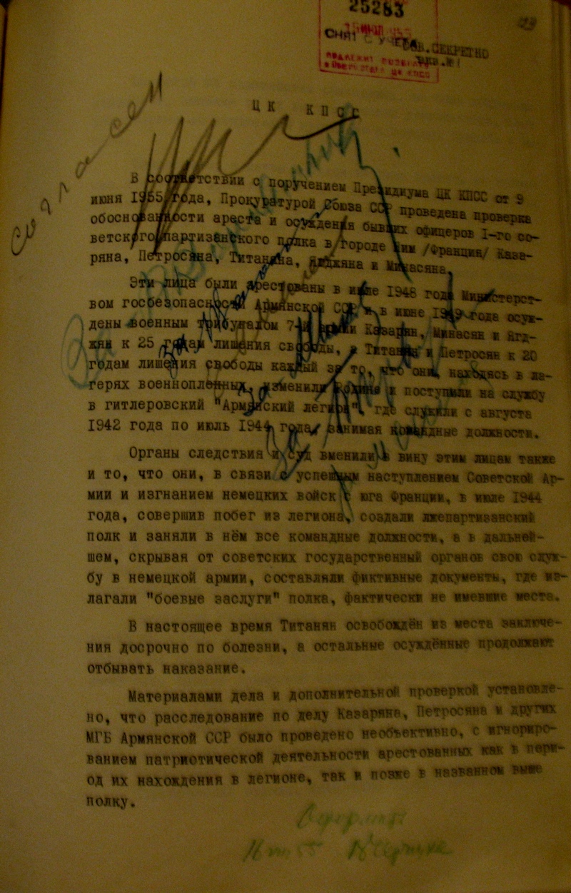 В соответствии с поручением Президиума ЦК КПСС от 9 июня 1955 года, Прокуратурой Союза ССР проведена проверка обоснованности ареста и осуждения бывших офицеров 1-го советского партизанского полка в городе Ним /Франция/ Казаряна, Петросяна, Титаняна, Ягждяна и Минасяна.