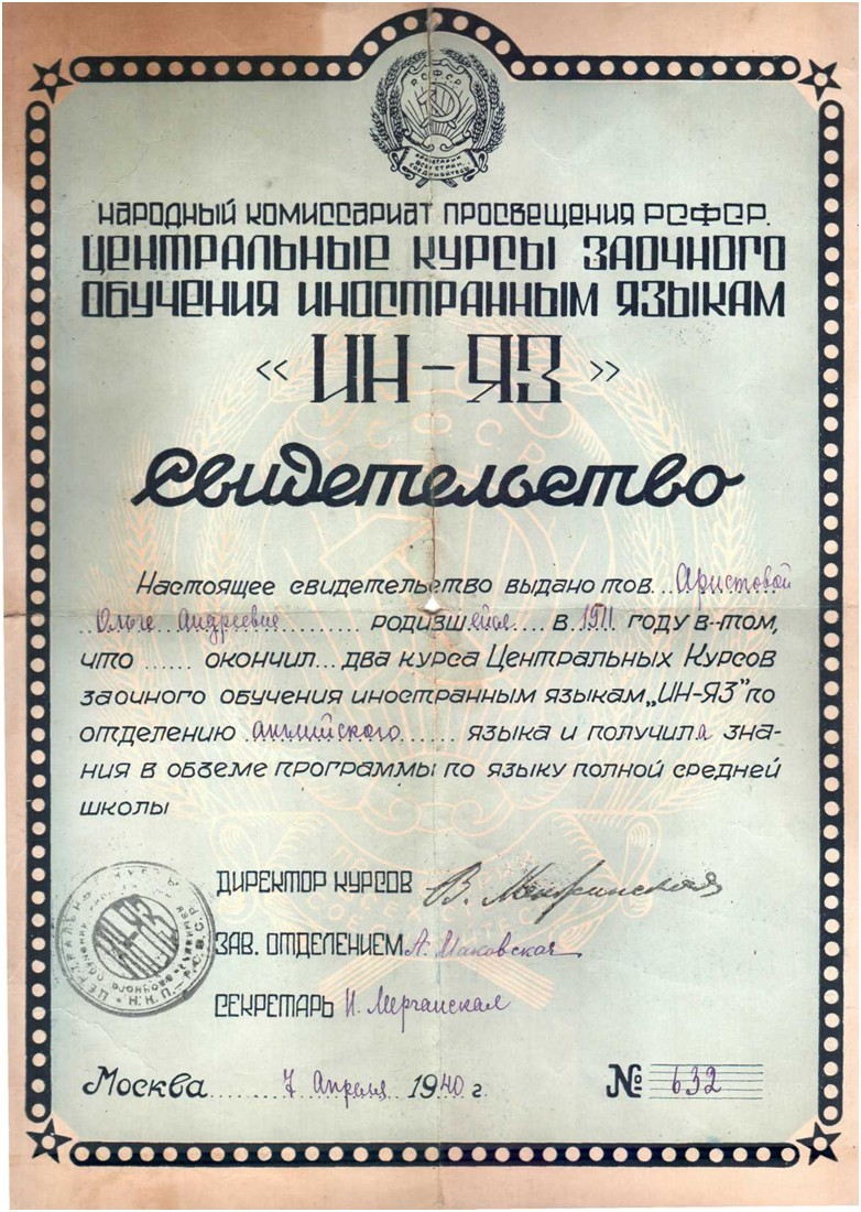 После войны маму направили в Тушино. Тогда Тушино считалось Красногорским районом Московской области. Мама вела начальные классы и занималась ликбезом [4] с рабочими. Вначале она работала без оплаты, чуть ли не за бутылку молока. Хотя её направили официально, но зарплаты не было. Потом она преподавала обществознание и обществоведение в школе. Она была очень любознательной. До войны смогла закончить 3 курса факультета иностранных языков, последний курс закончила уже после войны.