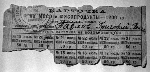 В сентябре были введены продовольственные карточки, и сразу стало заметно, что не хватает еды и, в первую очередь, хлеба. Карточки были четырёх разрядов: те, кто имел право на «рабочую» карточку, получали по 500 г хлеба, владельцы «служащих» карточек — по 400 г, столько же полагалось детям до двенадцати лет, а меньше всех — по 300 г — получали «иждивенцы». Карточки выдавались в домоуправлениях и представляли собой маленькие листки бумаги с неким подобием денежной защитной сетки; вверху было напечатано, какой категории карточка и на какой месяц она выдана, а ниже шли отрывные талончики, на каждом из которых стояло число (для хлебных карточек) и дневная норма. Талоны ни в коем случае нельзя было отрезать дома, эту операцию мог сделать только продавец непосредственно перед продажей хлеба. Неиспользованные талоны на вчерашний день (вероятность появления таковых была малой) становились категорически недействительными, зато можно было получить хлеб на завтрашний день, что практически все и делали.