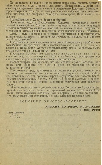 Пасхальная радость Воскресения Христова соединяется ныне с светлой надеждой на близкую победу правды и света над неправдой и тьмой германского фашизма, который на наших глазах сокрушается соединенной силою наших доблестных войск и войск наших союзников.