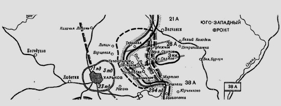 [4] 28-я резервная армия была сформирована в начале 1942 г. на Волге. Она предназначалась для Калининского Фронта и уже направила Опергруппу в Калинин для приема соединений и частей, когда штабу и управлению Армии переподчинили несколько дивизий из резерва Ставки ВГК и перебросили в Старобельск в полосу ЮЗ Фронта. В неудачно сложившейся Харьковской операции 28-я армия была введена в сражение на северном крыле и, нанося вспомогательный удар, на 2-е сутки вышла к железной дороге Белгород-Харьков, но получила приказ вернуться в исходное положение.