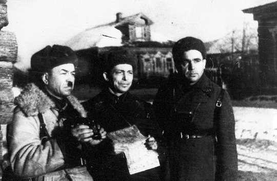 Генерал-майор И.В. Панфилов (слева), начальник штаба И.И. Серебряков и старший батальонный комиссар С.А. Егоров