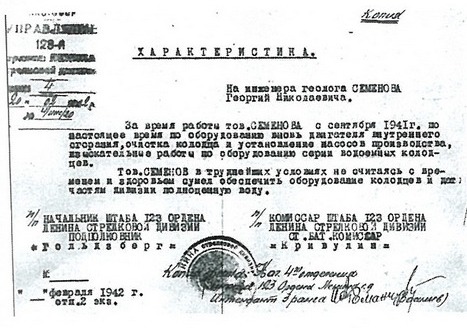 При необходимости он выполнял и другие инженерные работы, например, однажды отец достал в городе и запустил движок для местного освещения землянок на командном пункте дивизии. Сотрудники военно-геологических отрядов служили в воинских частях в качестве вольнонаёмных, жили в расположении этих частей и получали военный паёк, существенно превышавший нормы продовольствия для гражданских лиц. Военный период жизни и работы ленинградских геологов отчасти описан в книге «Геология Северо-Запада: вчера, сегодня и завтра. 75 лет Государственному геологическому предприятию «Севзапгеология»». Составитель Н.Д.Малов. (Отпечатано на Санкт-Петербургской картографической фабрике ВСЕГЕИ в 2004 г. Тираж 500 экз.). Прилагаю копию разворота из этой книги, относящийся к моему отцу и Марии Михайловне Семеновым.