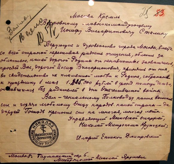 За время Отечественной войны по инициативе духовенства в фонд победы было собрано свыше трехсот миллионов рублей, не считая различного рода пожертвований вещами и продуктами. Так, например: