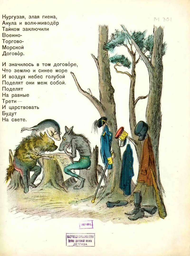 Одна из моих детских книг с прекрасными иллюстрациями и стихами Маршака называлась, как сейчас помню, «Акула, Гиена и Волк» в ней высмеивалось злободневное военное соглашение тех времен «Ось Рим — Берлин — Токио».
