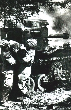 В четыре часа ночи 22 июня 1941 года навстречу колонне полка с западной стороны по-явились три самолета. Я возглавлял в составе отделения разведки передовую группу полка и принял сначала эти самолеты за «сталинских соколов», как мы обычно называли наших летчиков. Однако это были фашистские самолеты. И первый из них выпустил пулеметную очередь по нашей передовой разведгруппе. К счастью, никто из нас не пострадал. Полк двигался в развернутом боевом порядке и готов был отразить силами огневых средств, установленных на автомашинах (четырехспаренные зенитные пулеметы), налеты авиации противника. Что и произошло. Два самолета врага были сразу же сбиты огнем зенитных пулеметов, третий удалился на запад. Были раненые и среди личного состава полка. Мы пока не знали, что это — провокация или война.