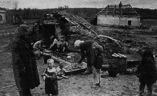 Там, где проходили нацистские войска, оставались руины. На фотографии — развалы села под ХарьковомК сожалению, это не было понято и осознано — и вскоре в уничтожении нацистами советских мирных граждан и военнопленных неожиданно стали обвинять советскую же власть, которая-де провоцировала добропорядочных немцев на жестокие и массовые убийства, а тех, кто выживал под оккупацией, гнала в сибирские лагеря. Все это было не более чем повторением тезисов геббельсовской пропаганды, однако добровольно разоружившаяся официальная историческая наука не смогла адекватно ответить на нападки антисоветских пропагандистов; нападки столь же агрессивные, сколь и лживые.