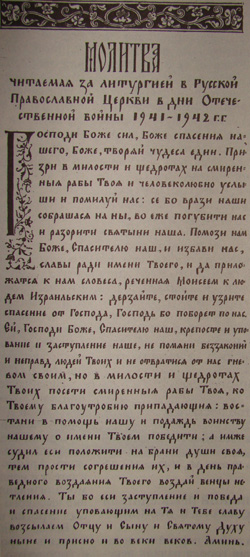 В первый день войны глава Православной Церкви в России патриарший местоблюститель блаженнейший Сергий, митрополит Московский и Коломенский, обратился к пастырям и верующим со своим посланием, разосланным в тот же день по всем приходам. В нем он благословляет всех православных на защиту священных границ нашей Родины.