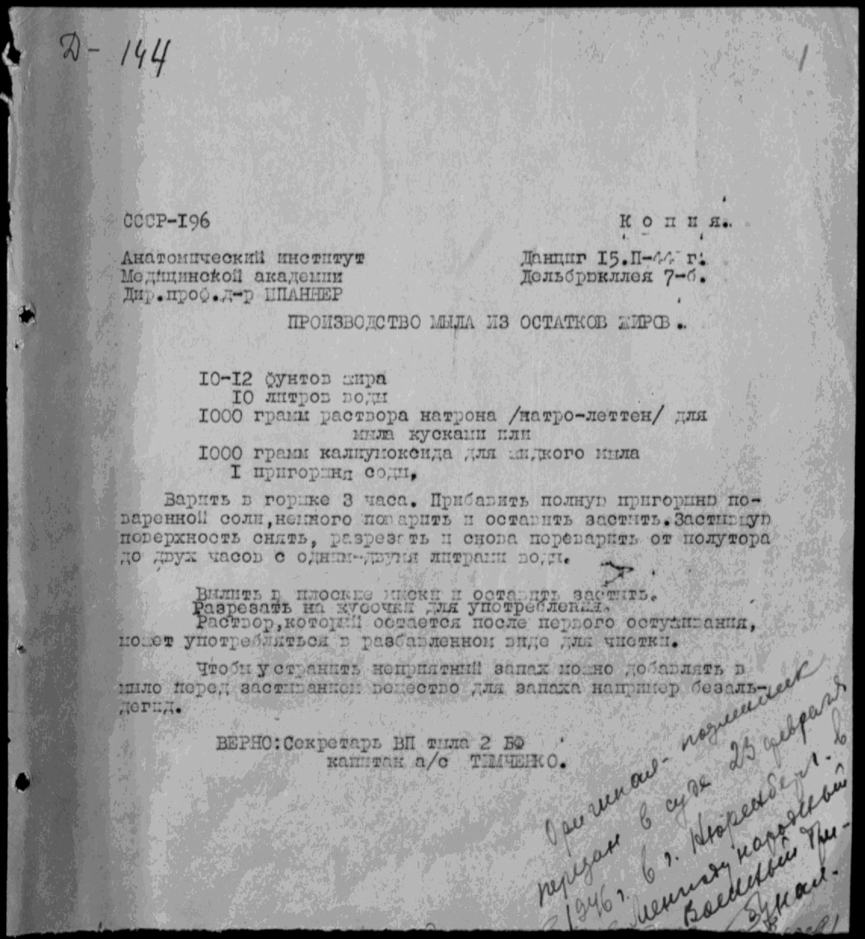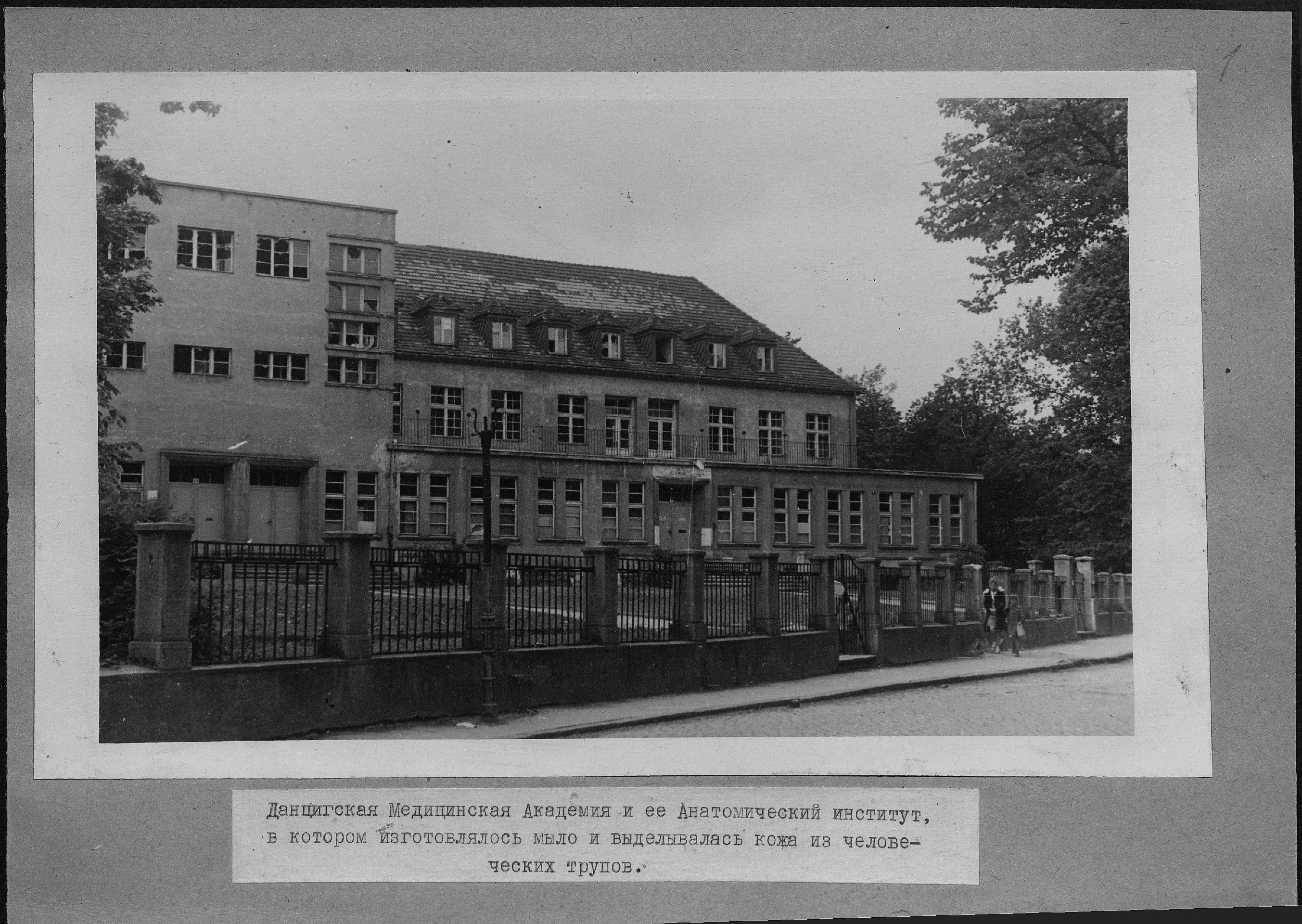 В Государственном архиве Российской Федерации в фонде Чрезвычайной государственной комиссии по установлению и расследованию злодеяний немецко-фашистских захватчиков храниться папка, озаглавленная «Докладные записки, акты и протоколы свидетельских показаний об изготовлении мыла из человеческих трупов немецкими учеными в Анатомическом институте в гор. Данциг». Свидетельства были собраны в 1945 г. вскоре после занятия Данцига (Гданьска) советскими войсками в конце марта 1945 г.. Дело насчитывает 150 листов.