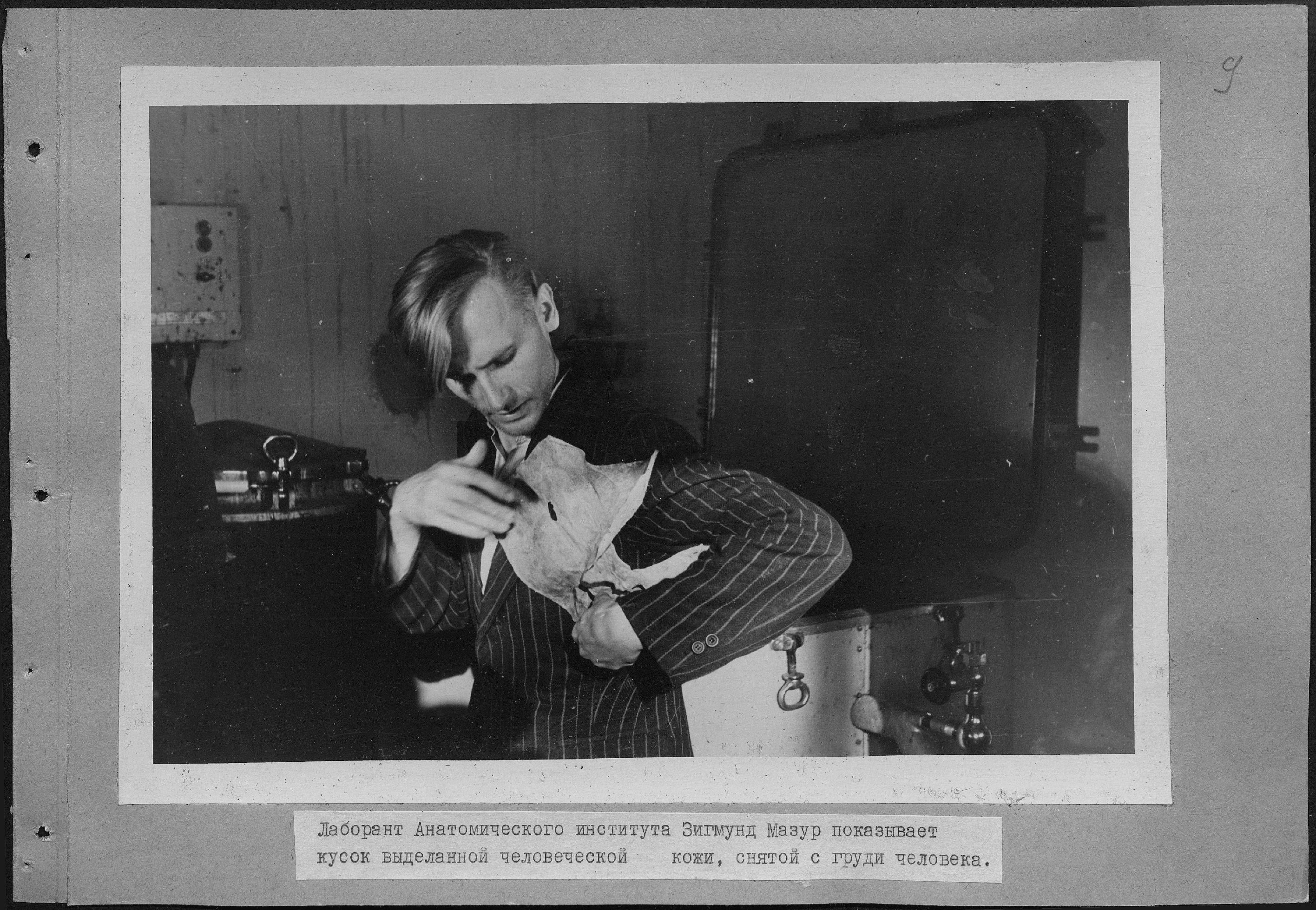 Ответ: в начале февраля месяца 1945 года мне потребовалось мыло для стирки своего белья. Я жил на территории медицинской академии, там, где размещалось пять институтов, в том числе: физиологический и анатомический. Так как мыла у меня не было, то я обратился к коменданту здания немцу Леону Пипер с просьбой дать мне мыла. Леон Пипер сказал, что у него мыла нет, и направил меня к препаратору Анатомического института Мазуру, сказав, что «у Мазура есть мыло». Мазур был в маленьком домике, где была лаборатория. Я спросил у Мазура, есть ли у него мыло, и вошел в лабораторию. В эту лабораторию я попал впервые в этот раз. Там я увидел следующую картину: Мазур был в белом халате, и там же был препаратор Боркнер, тоже в белом халате, оба стояли в первой комнате и что-то мешали в белых эмалированных ведрах, которые подогревались специальными газовыми горелками. Перемешивание они производили металлическими мешалками. Рядом на столе лежали в этой же комнате остатки человеческих тел – мягких тканей с жиром, освобожденные от костей. В комнате был очень неприятный запах. Я заинтересовался. В углу был автоклав с людскими костями, это я видел, так как открывал крышку автоклава. В другом углу в ящике так же были человеческие кости. Около стола стоял ящик на полу, в котором были человеческая кожа уже засохшая, твердая.