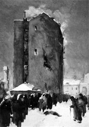 Супа в тот день не дали, и ребята удрали с последнего урока. На Невском у булочных нет очередей, так как нет хлеба. На улице 3 Июля я увидела громадную очередь и встала за хлебом. Было очень холодно. Прошло три часа. Вдруг стали говорить, что хлеба мало. Прошел еще час, очередь подходила, но хлеб кончился. Я чуть не плакала от обиды. Страшно хотелось есть, меня всю трясло от холода. Я без хлеба пошла домой. Дверь открыла мама. «Валя, не пугайся, папа умер», — сказала она. Я бессмысленно посмотрела на нее, плакать я не могла. Вечером мы перетащили папу в детскую.