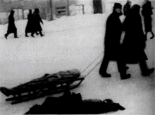 Развилась кража: коптилку внезапно тушили, и воры хватали со стола отрезанные талончики и карточки. Раз украли и у меня талончики. Сцены бывали ужасные. Некоторые голодающие буквально приползали к столовой, других втаскивали по лестнице на второй этаж, где помещалась столовая, так как они сами подняться уже не могли. Третьи не могли закрыть рта, и из открытого рта у них сбегала слюна на одежду. Лица были у одних опухшие, налитые какой-то синеватой водой, бледные, у других — страшно худые и темные. А одежды! Голодающих не столько мучил голод, как холод — холод, шедший откуда-то изнутри, непреодолимый, невероятно мучительный. Поэтому кутались как только могли. Женщины ходили в брюках своих умерших мужей, сыновей, братьев (мужчины умирали первыми), обвязывались платками поверх пальто. Еду женщины брали с собой — в столовых не ели. Несли ее детям или тем, кто уже не мог ходить. Через плечо на веревке вешали бидон и в этот бидон клали все: и первое, и второе. Ложки две каши, суп — одна вода. Считалось все же выгодным брать еду по продуктовым карточкам в столовой, так как «отоварить» их иным способом было почти невозможно.