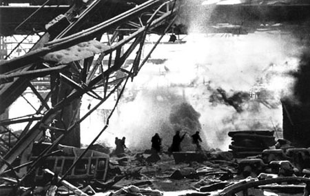 Связной ведет нас с Воителевым к заводу «Баррикады». Перелезаем кирпичные завалы, ползем под закопченными сводами. Опять завалы, рвы, воронки на тротуарах, расплавленные железные балки. Жар догорающих домов, грохот внезапно рухнувшей стены…