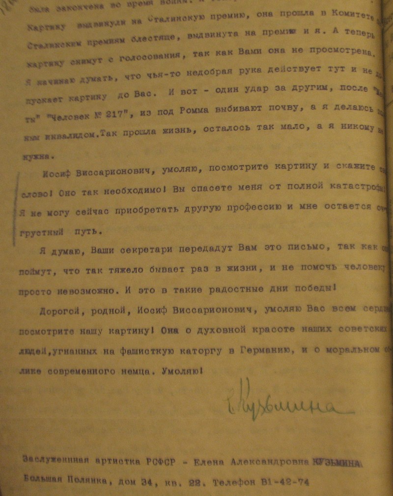 Иосиф Виссарионович, умоляю, посмотрите картину и скажите свое слово! Оно так необходимо! Вы спасете меня от полной катастрофы! Я не могу сейчас приобретать другую профессию и мне остается очень грустный путь.