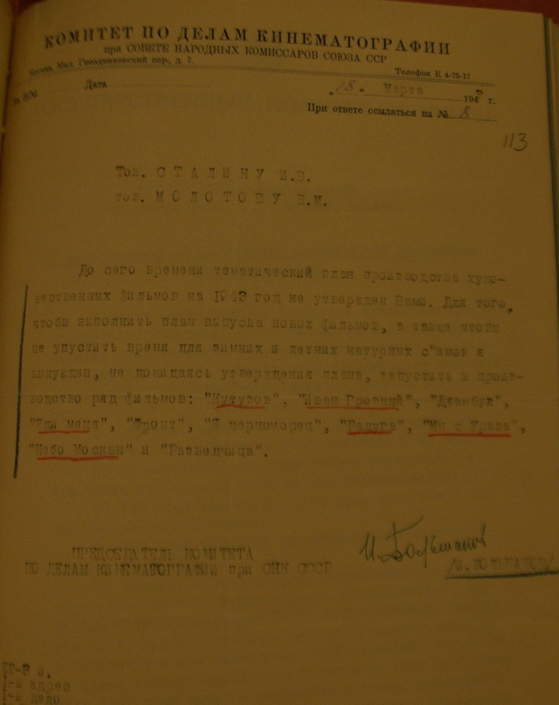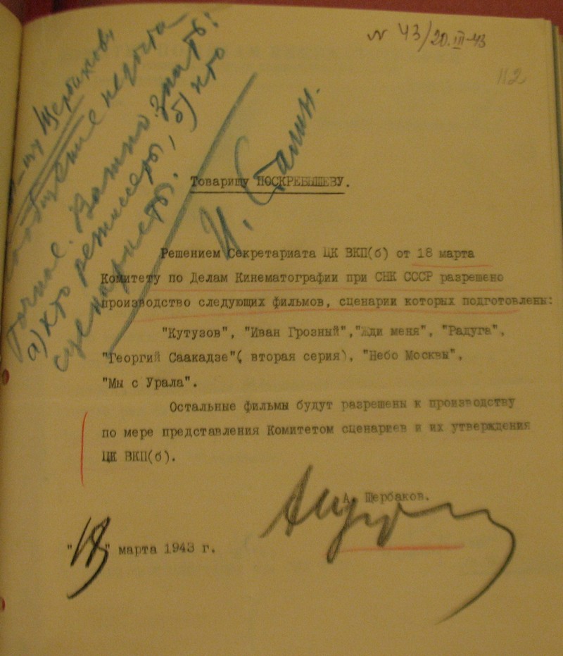 До сего времени тематический план производства художественных фильмов на 1943 год не утвержден Вами. Для того, чтобы выполнить план выпуска новых фильмов, а также чтобы не упустить время для зимних и летних натурных съемок я вынужден, не дожидаясь плана, запустить в производство ряд фильмов: «Кутузов», «Иван Грозный», «Джанбул», «Жди меня», «Фронт», «Я черноморец», «Радуга», «Мы с Урала», «Небо Москвы» и «Разведчица».