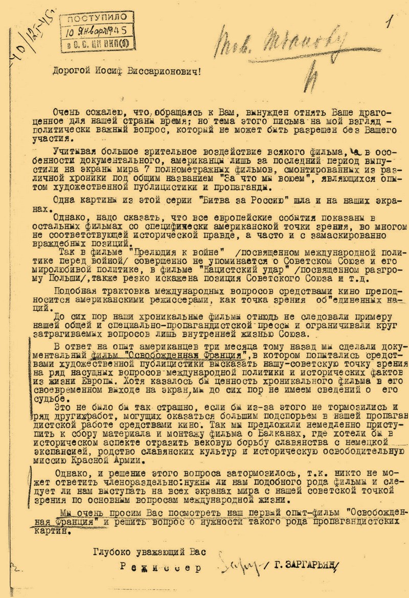 Мы очень просим Вас посмотреть наш первый опыт-фильм «Освобожденная Франция» и решить вопрос о нужности такого рода пропагандистских картин.