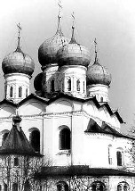 Успенский собор Иверского монастыря большой и до сего года неотапливаемый, находится в состоянии непрестанной слабодвижущейся реставрации. Но службы идут. С темных лупатых стен на нас глядят полуразрушенные фрески. И только нимбы на них светло золотятся – сами обновились на диво и радость насельникам. Клироса два: на одном монахи постарше поют почти в один голос, но всегда очень бодро; другой клирос состоит из двух родных братьев-иноков, поющих знаменным распевом.