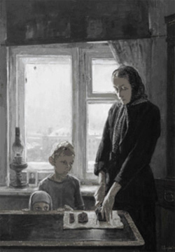 Мы лежали втроем на кровати в пальто, обуви и под кучей одеял. Жильцы почти все уехали в эвакуацию, наш хозяин тоже, мы остались в его комнате одни. И вот мы ждали, когда хлопнет дверь и появится мама с хлебом. 125-граммовый крошечный черно-зеленый глиняный кусочек, чуть больше спичечного коробка, я до сих пор помню этот «золотой» кусочек. И уже не было родственных чувств, каждый дрожал над своей порцией. Мама делила хлеб на 5 частей и каждый берег свой кусочек, свою крошку за пазухой. Папа! Мой большой добрый папа следил за дележкой, с недоверием, тут же заворачивал хлеб в тряпочку и съедал его под одеялом, а потом все плакал и просил есть, считал, что ему досталось меньше. Только мама отщипывала от своего кусочка – крошечки и, как конфетку, давала Алику.