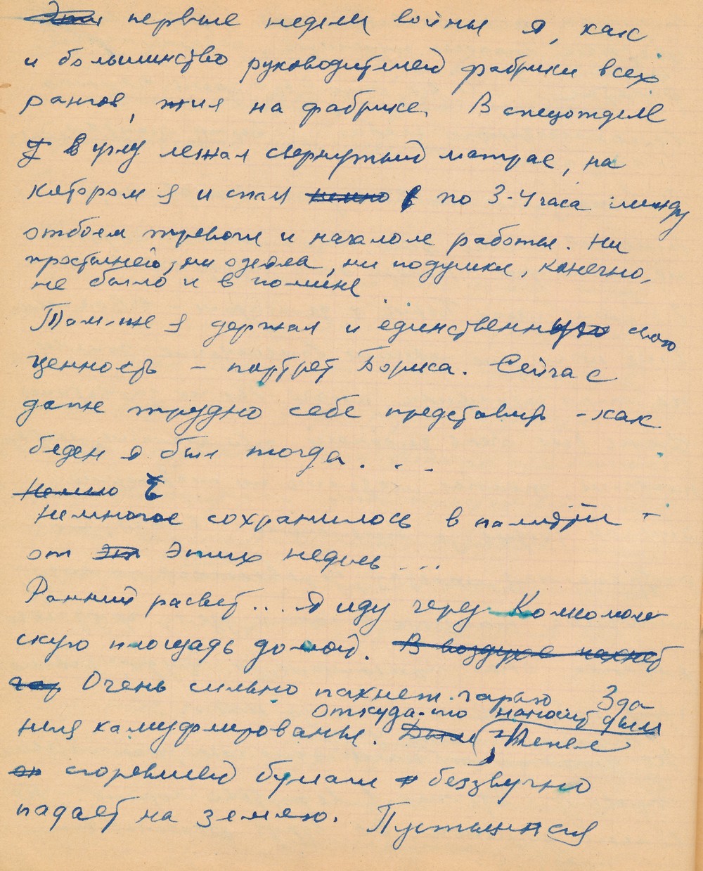 Первые недели войны я, как и большинство руководителей фабрики всех рангов, жил на фабрике. В спецотделе в углу лежал свернутый матрас, на котором я и спал по 3-4 часа между отбоем тревоги и началом работы. Ни простыней, ни одеяла, ни подушки, конечно, не было и в помине.
