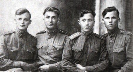 Младшие лейтенанты (слева направо): пилот М.Т, Красновский, штурманы Г.Б. Удинцев и И.П. Попов , пилот В.И. Думанский, 1944 году
