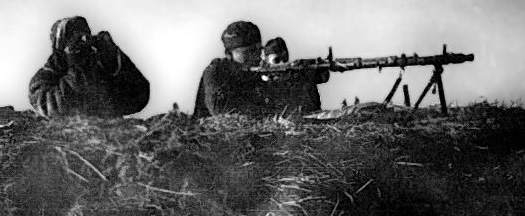 Затем Травкин подполз к своим людям и стал наблюдать немецкую оборону. Траншея была вырыта недавно и еще не закончена. Перебегающим по ней немцам она едва доходила до плеч. Впереди траншеи — проволочное заграждение в два кола. Разведчиков отделяла от немцев неширокая речка, поросшая камышом. На бруствере траншеи во весь рост стоял человек и смотрел на восточный берег в бинокль.