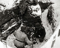 Разведчики, сидя по ночам на бывшем берегу реки (теперь это зовется нейтральной полосой), слушают стук немецких топоров и голоса немецких саперов, тоже укрепляющих свой передний край.